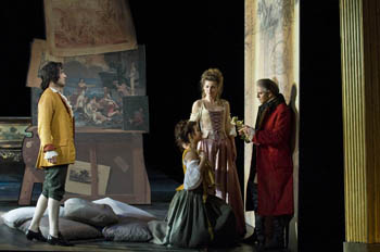 Ce parti pris stylistique affecte tous les objets du spectacle. On remarque les efforts d’ornementations d’Anna Bonitatibus, excellent Chérubin aux phrases très soignées, et de la jeune Comtesse Maija Kovalevska. Dans la fosse, Francesco Corti au clavier, très applaudi, donne un véritable art du récitatif : reprenant les motifs mélodiques qui précèdent, jouant de la mise en scène en ajoutant trilles et mordants pendant les bégaiements de Don Curzio – un héritage encore de la doctrine imitative baroque – et soutenant les chanteurs avec une effervescence virtuose2. Côté mise en scène aussi, pas de décors mais des fragments de peinture ou d’objets qui peuvent servir seulement à cacher (Chérubin bien sûr), illustrer (au dernier acte), voire parodier : Hamlet, lorsque le comte regarde le crane posé devant lui avec une bonne dose de perplexité. On regrette quand même que tout cela manque de visibilité, au sens propre comme au sens figuré, c’est à dire que l’abondance des reproductions de tableaux sont parfois à court d’à propos, et que les éclairages mettent difficilement quoi que ce soit en valeur.