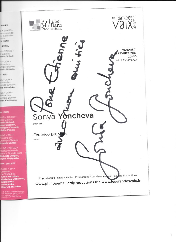 Je retrouve Sonya Yoncheva le 6 février 2015 à la salle Gaveau pour un récital de lieders de compositrices romantiques (Clara Schumann, Pauline Viardot,…), avec en prime la séance de dédicace à la fin…