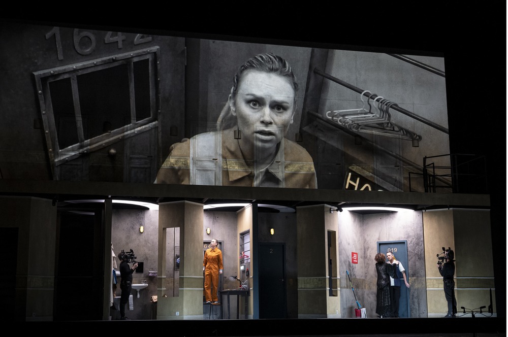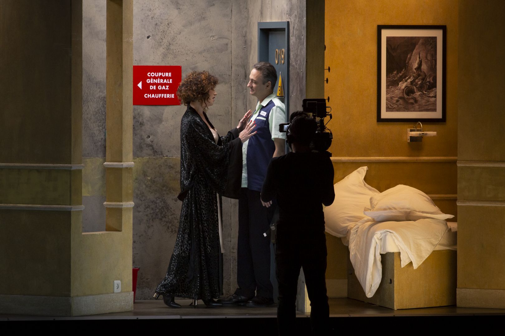 L’auditeur auquel il est arrivé de s’égarer dans un de ces hôtels de dizaines d’étages comprendra sans peine le choix de Fabrice Murgia de transposer l’action dans un palace contemporain. Pour renouer avec l’esprit de l’ouvrage, fabuleux, il use avec brio de toutes les techniques. «Film d’opéra plutôt qu’opéra filmé » nous dit le réalisateur. Ainsi le prologue et les trois actes sont-ils donnés enchaînés (version streaming). Le cadre scénique est divisé en deux registres, exploités simultanément ou individuellement, dans leur ensemble ou réduits à une pièce, un couloir. D’autre part, la vidéo mobile permet de multiplier les regards, d’offrir des gros plans, des travellings, avec des cadrages subtils, recourant parfois au noir et blanc argentique. Un dispositif ingénieux de trois tournettes occupant le centre du registre inférieur autorise le renouvellement des scènes. Magistraux, les éclairages, assortis de leurs artifices, vont s’avérer aussi bienvenus dans les scènes les plus réalistes que dans celles où la magie des transformations répond aux exigences de l’histoire. Les références, les clins d’œil participent à la complicité voulue par le metteur en scène belge : Angelica-Barbarella, le géant-créature de Frankenstein, la Fontaine de Duchamp, la chambre 1642 etc.