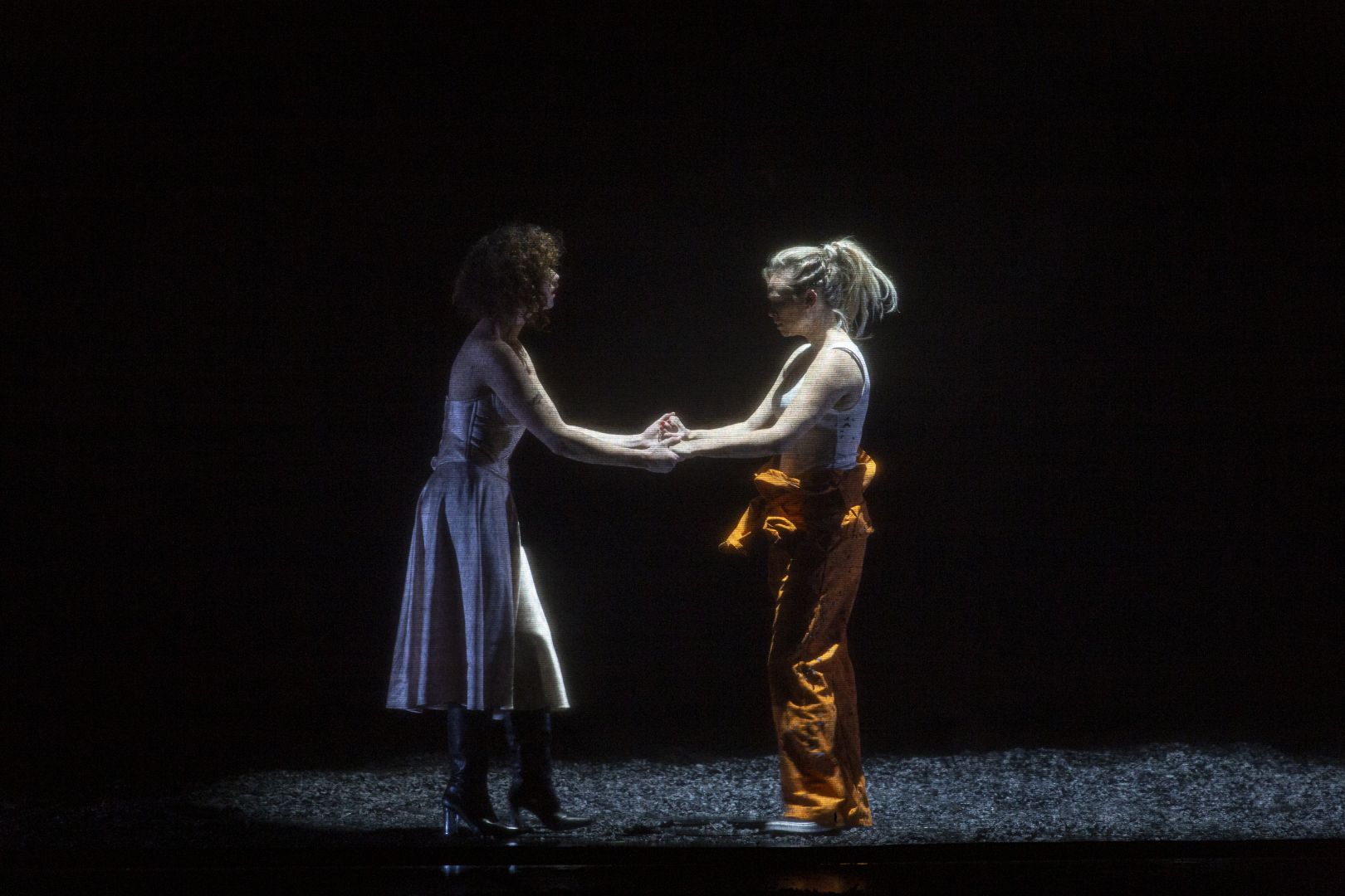 Si, dans sa première apparition (la Peinture), Deanna Breiwick, surprend par une émission quelque peu pointue, celle-ci fait place à une voix épanouie, chaleureuse, lorsqu’elle apparaît en Bradamante, héroïne ô combien humaine, détenue en combinaison orange. La fraîcheur du timbre, mais aussi sa colère et son désespoir, assortis de moyens exceptionnels, lui permettent une expression toujours juste, touchante. Un des sommets de la partition réside dans sa scène « Dove mi spingi, amore… Prendi cor, o mio core». Que ce soit incarnant la Magie dans le prologue, Marfisa retrouvant sa maîtresse emprisonnée, ou chantant Doralice, Mariana Florès est toujours aussi éblouissante. Une sûreté d’émission, des couleurs, un timbre et une articulation à nuls autres pareils. L’Angélique d’Arianna Venditelli crève l’écran : son chant et son jeu ne séduisent pas seulement ses prétendants. Son « Gentilissima imago », avec la harpe à son début, est d’une émotion juste. La Musique, Olympia et Echo sont chantés par Lucia Martin-Carton, splendide soprano. Son air « Inerme abbandonata » est un des plus beaux de la partition. Gwendoline Blondeel, la Poésie, puis Fiordiligi, complète harmonieusement le quintette de sopranos. Maître des horloges et des illusions, jusqu’à leur disparition, Mark Milhofer nous vaut un superbe Atlante : tour à tour calculateur maléfique, impérieux, et protecteur sensible du héros, il use d’une voix bien timbrée, ample, projetée à souhait, pour traduire avec justesse cette complexité, servi par un jeu toujours approprié. Toutes ses interventions sont aussi bienvenues. Fabio Trümpy campe un Ruggiero valeureux, combattant héroïque et tendre. Sa plainte qui ouvre le deuxième acte « Deh, dimmi, aura celeste » comme chacune de ses interventions, tout nous convainc. Victor Sicard, dont on connaît bien les qualités, aborde ici un rôle essentiel qui lui va comme un gant : son Orlando, épris d’une Angélique dédaigneuse, est exemplaire. Son long monologue durant lequel il erre dans le couloir de l’étage est une réussite singulière. Sacripante et Ferrau à la recherche d’Angélique, apparaîtront tout au long de l’ouvrage. Leur extraordinaire duo du premier acte ne sera qu’un avant-goût de ce que nous offriront Grigory Soloviov (Gradasso et le géant non moins impressionnants, «Portalo, ché mi prende un’immensa pietà ») et Valerio Contaldo, qui chantera aussi Astofo, insensible à l’amour. Ce dernier nous vaut une belle scène avec le chœur de jeunes filles « « Non tra’ fiori l’onor verace » et une autre avec Olympia « Entro all’ampio giardin » qui sont autant de bonheurs, tout comme « Non tra’ fiori l’onor verace » du II. En Manricardo, Alexander Miminoshvili, beau baryton-basse, fait forte impression dès ses retrouvailles avec Gradasso. Prasillo, ici chanté par un contre-ténor d’exception, Kacper Szelazek, remarquable dès son premier air « Non è pendice in queste selve », « S’avvieti, che s’adiri » est superbe de virtuosité comme de force. Son incarnation du nain sera également réussie. Alceste, chanté par André Lacerda, n’est pas que pittoresque (chapeau, lunettes et veste violets).
