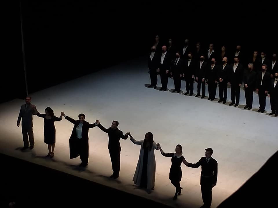 Vocalement, à une exception près, le compte y est, qui réussit presque le grand chelem de faire oublier aux nostalgiques certain âge d’or de la production. Bradamante échappe quelque peu à Roxana Constantinescu, pourtant d’un lumineux engagement, mais contrainte à quelques émissions en force aux moments les plus ardus de la vocalisation (Vorrei vendicarmi). Gaëlle Arquez franchit avec succès les fourches caudines de Sta nell’Ircana et touche juste avec un Ruggiero à l’élégie sincère (Mi lusinga il dolce affetto est à pleurer). Sabine Devieilhe, irrésistible, recueille un triomphe auprès des amateurs de performance, comme des autres, en sollicitant systématiquement sur chacune de ses interventions un registre atmosphérique que Carsen utilise avec beaucoup d’à-propos. Le timbre vite identifiable de Jeanine De Bique retient également l’attention. Son Alcina chante merveilleusement. Ombre pallide manque encore un peu d’ampleur sur sa conclusion mais Ah! mio cor !, longuement étiré, avec un sens du détail inouï, par Thomas Hengelbrock, est le grand moment de la soirée. Bien que d’une grande beauté, la bête de scène est encore en devenir au cours de la longue scène où Alcina vacille seule de dos entre ses murs avant de s’affaler contre l’un d’eux dans la pénombre après qu’Oronte l’a informée de l’abandon de Ruggiero. Dans cet opéra à la parité inversée, les hommes ont peu à défendre. Le rôle d’Oberto ayant été évacué, ne subsistent qu’Oronte que Rupert Charlesworth, très à l’aise scéniquement, nimbe d’une fougue inédite (enivrant Un momento di contento), et Melisso que Nicolas Courjal surligne, non sans une touchante fragilité, de sa noirceur coutumière. Le chœur masqué, mêlé à l’homoérotisme ambiant, ouvre et referme fugacement un opéra entièrement dévolu aux solistes.